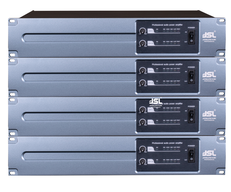 DE-2300 | 双通道功率放大器 1.额定功率:2×2Ω:560W(@ 1 kHz<1% T.H.D.两通道驱动), 2×4Ω:375W(@ 1 kHz<1% T.H.D.两通道驱动), 2×8Ω:250W(@ 1 kHz<1% T.H.D.两通道驱动); 2.桥接:1×4Ω:1120W (@ 1 kHz<1% T.H.D.), 1×8Ω:750W (@ 1 kHz<1% T.H.D.), 1×16Ω:500W (@ 1 kHz<1% T.H.D.); 3.频率响应: 20Hz - 20 kHz; 4.THD+N:<0.05%; 5.阻尼系数:>1000; 6.输入灵敏度: 0.775V、1.0V、32dB; 7.信噪比:> -102dB; 8.LED显示,信号指示,状态指示灯、限幅指示; 9.保护:电源欠压保护、功放输出直流保护、过热保护、温度功率控制、过载功率控制; |